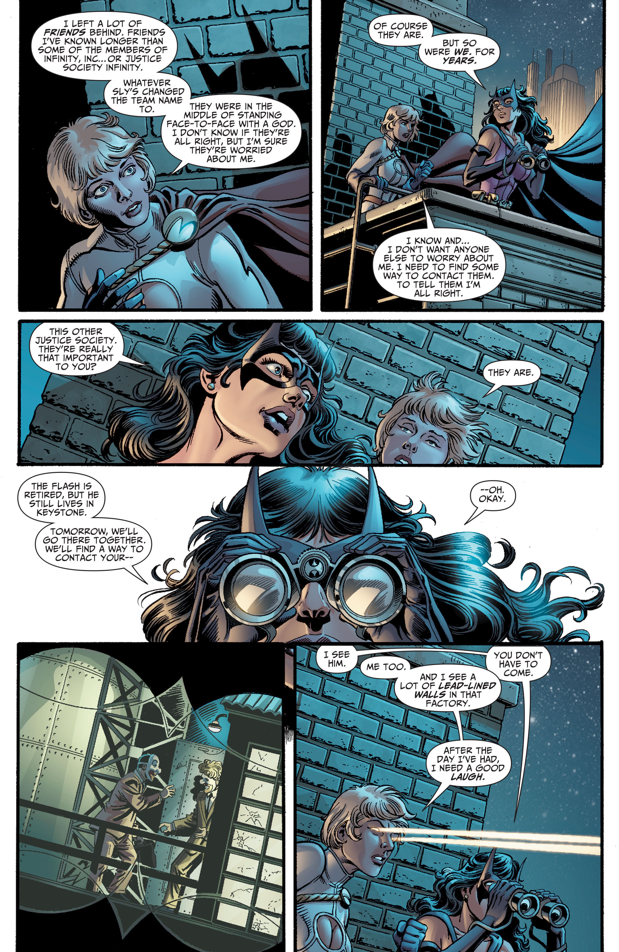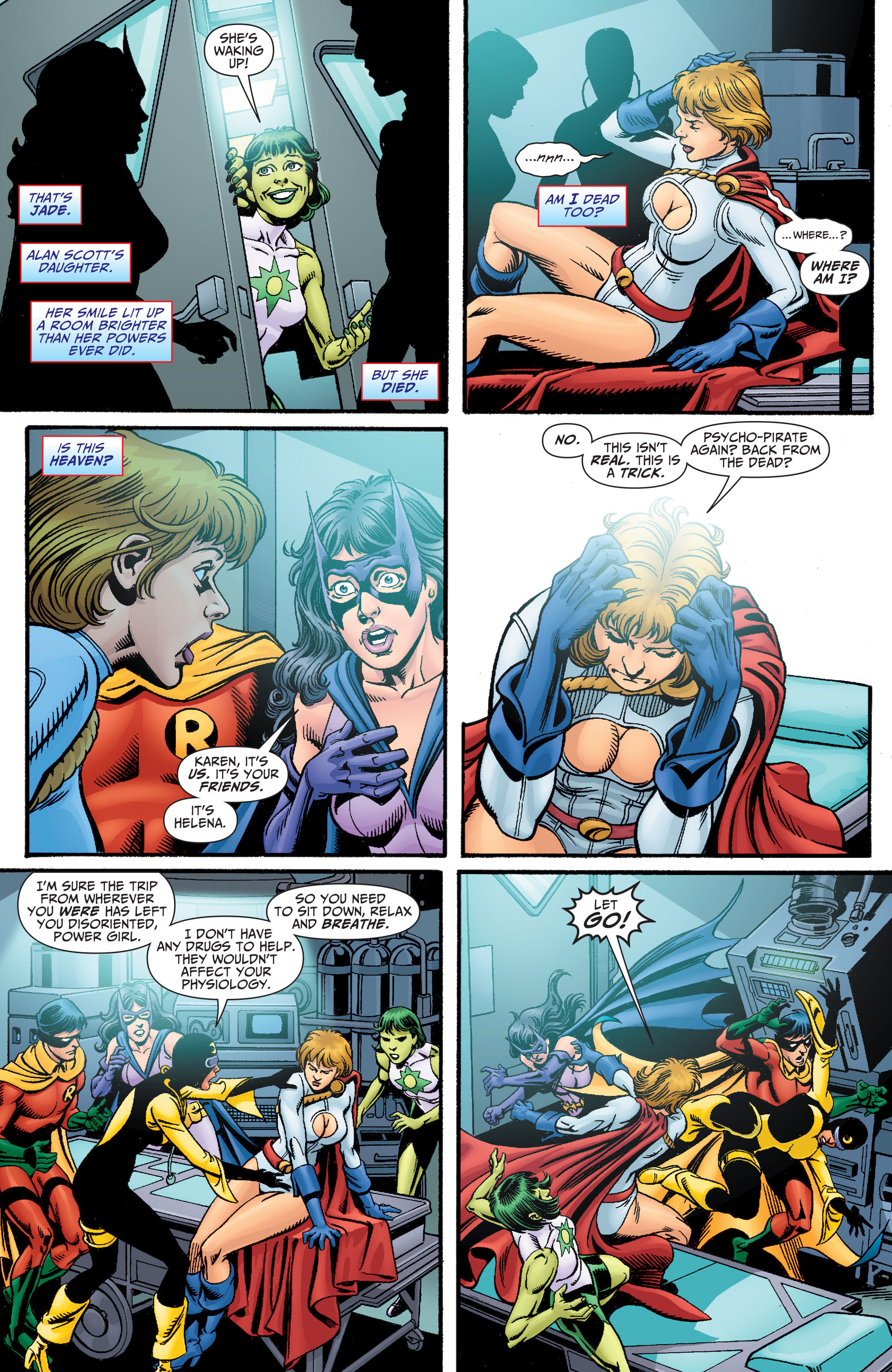 Following the events of Infinite Crisis, Power Girl would help reform the Justice Society and was elected as its chairwoman. She’d help the team out with their missions, serving as their surrogate leader until they encountered the Third World deity Gog. While fulfilling the team’s subconscious desires, Gog sensed Karen’s grief at being the only survivor of Earth-Two and created a warp to send her “home.” Upon passing through the other side, she was met with the familiar faces of Dick Grayson, Helena Wayne and the members of the Justice Society and Infinity Inc. From the looks of things, it was as if Earth-Two had been restored!