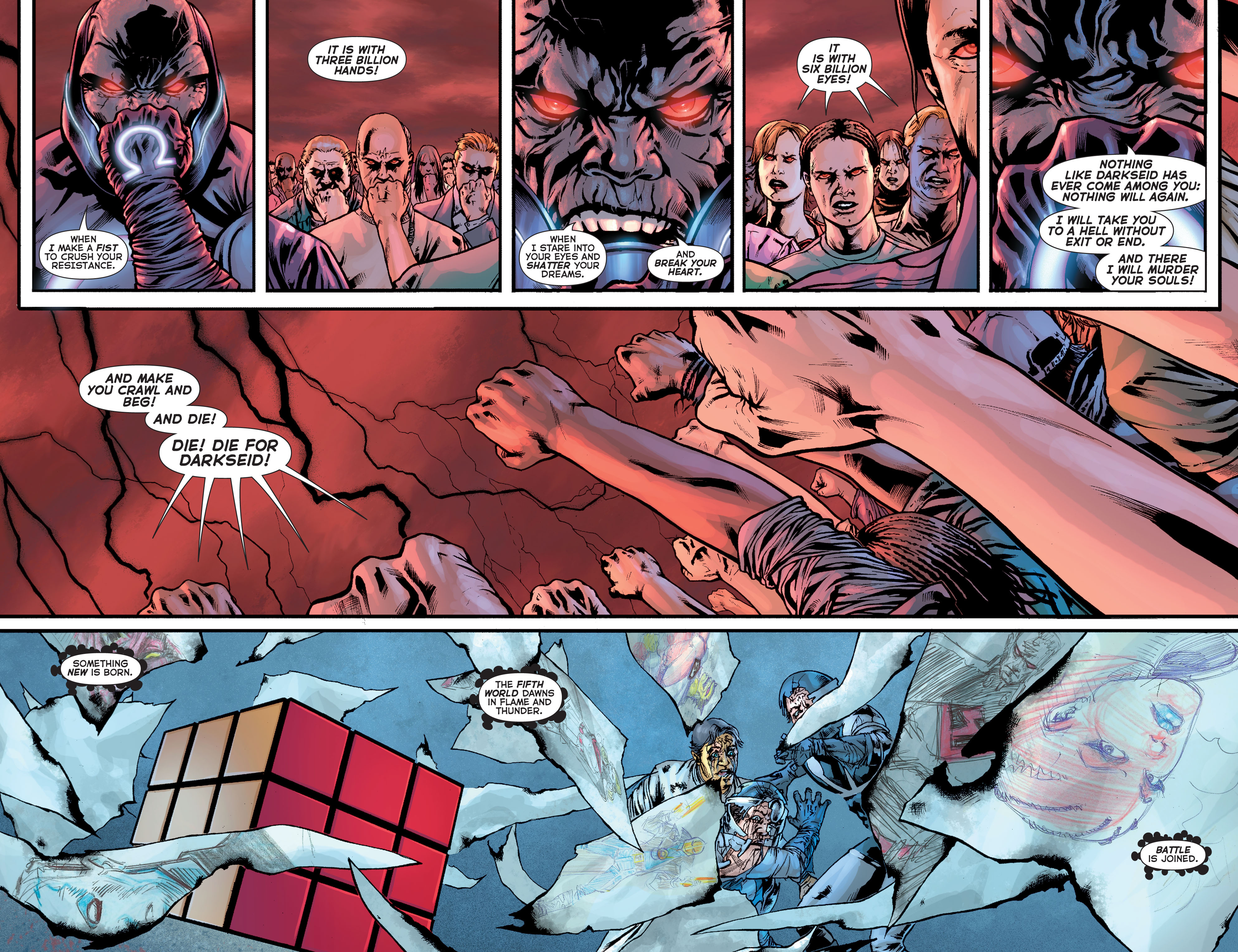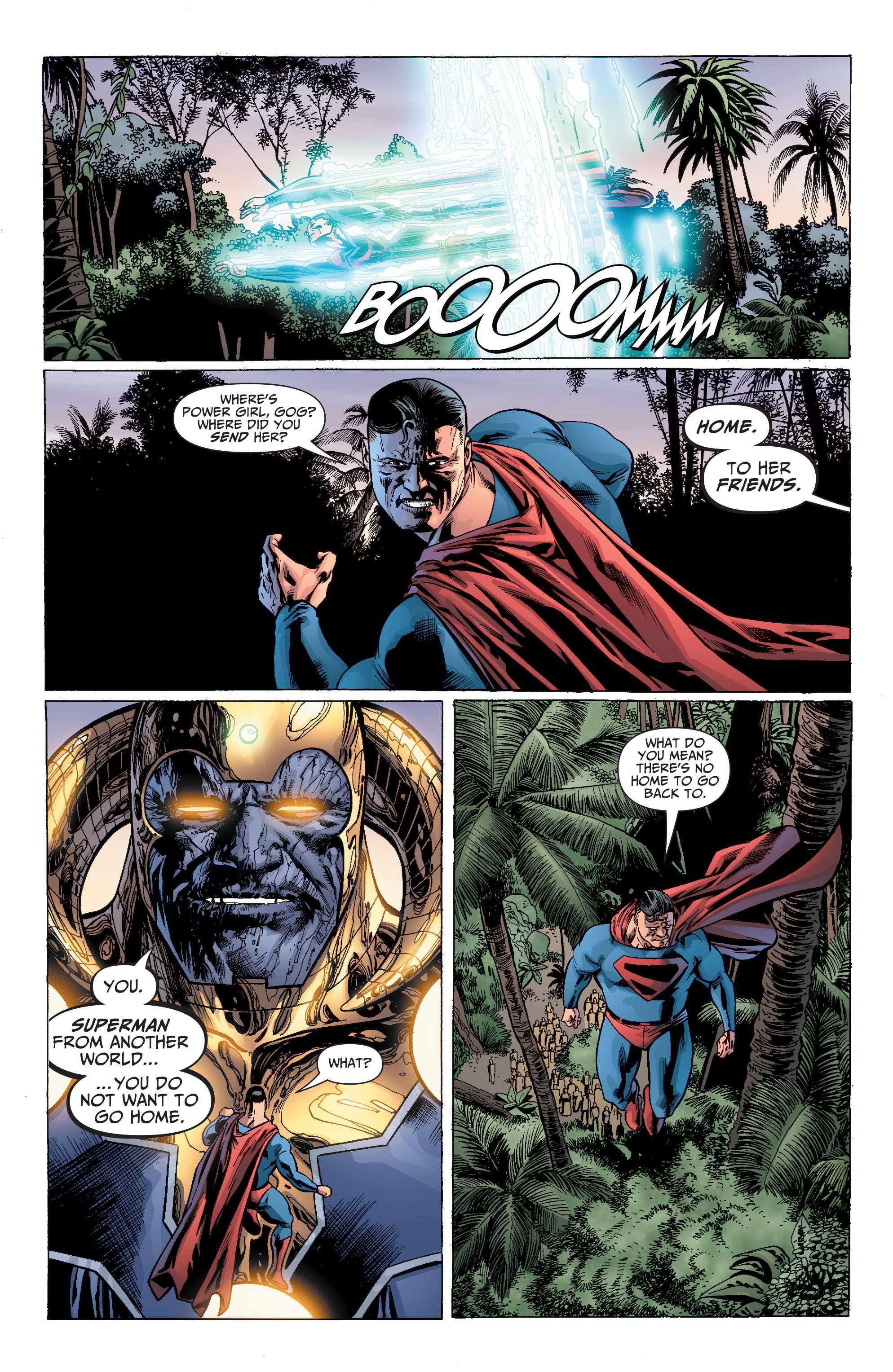 But aside from her restored origin, the survivors also revealed their plan to restore the multiverse, as they felt that the New Earth universe had become too desolate and grim. While she was at first conflicted, Karen came to oppose the idea when she learned that Alexander planned to destroy New Earth to bring the multiverse back. She tried to fight him, but was captured and placed inside of his machine. With the help of Power Girl, among many other unwilling power sources, Alexander successfully restored the multiverse, but his plan to destroy New Earth was stopped by the remaining heroes. Power Girl would later be freed from the machine and take part in the final battle, which ended with a tearful farewell to the dying Earth-Two Superman