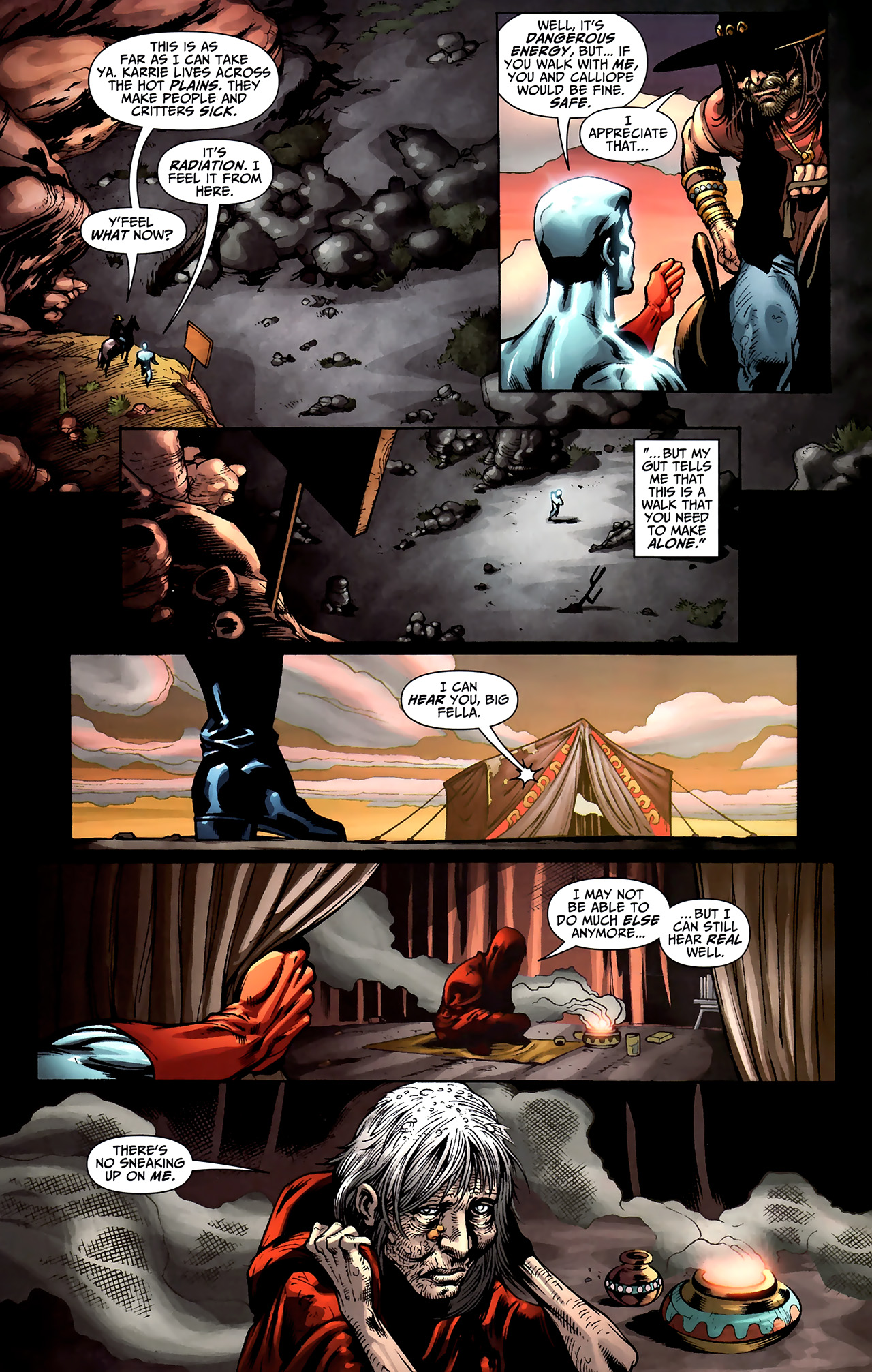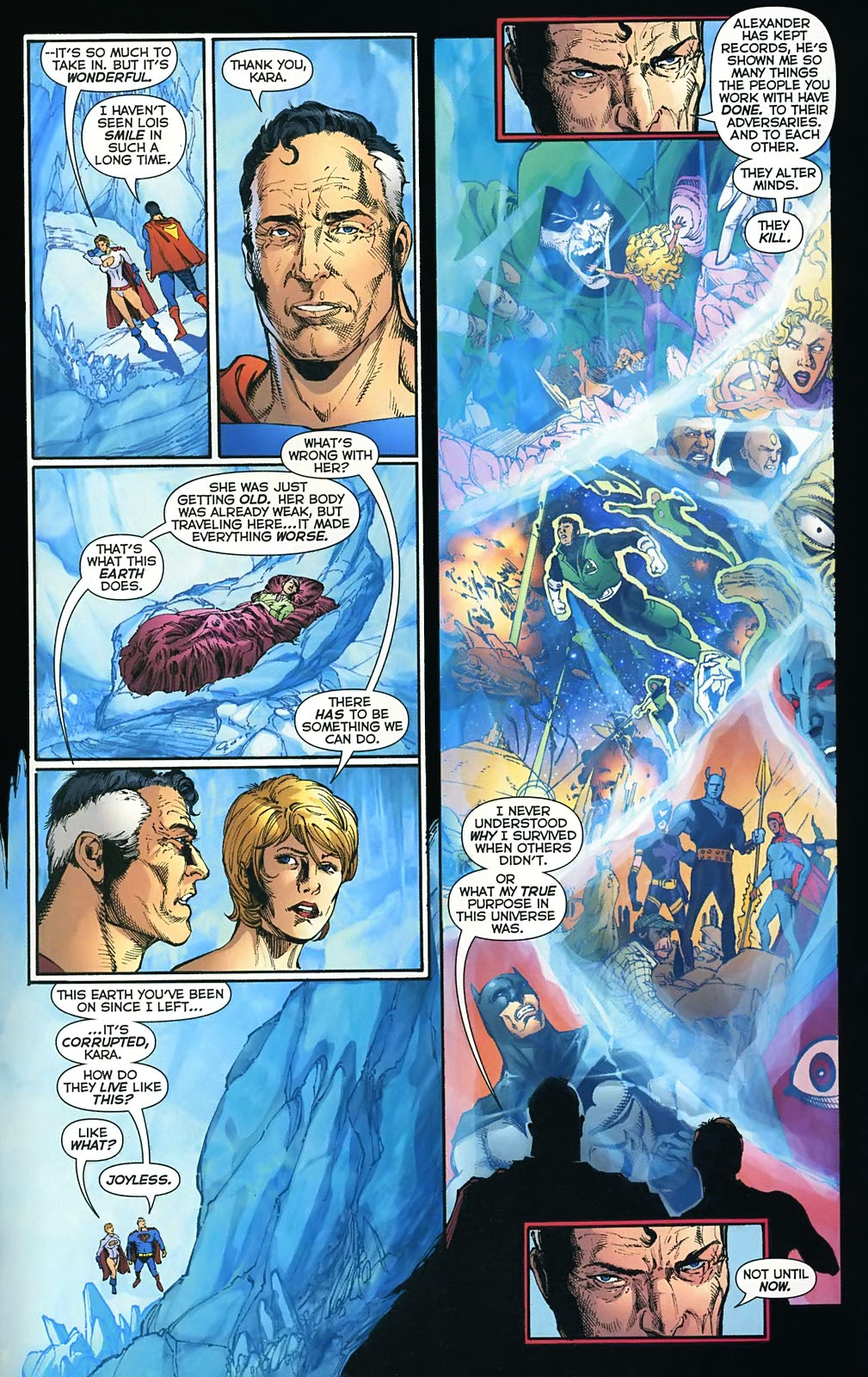Following this, JSA Classified #1 would establish that Power Girl could still recall her “false” Kryptonian memories, with Issue #4 revealing that fellow Crisis survivor Psycho Pirate still remembered the events of the previous world and that Karen subconsciously remembered her Pre-Crisis history. Psycho Pirate attempted to exploit this by creating psychic illusions of her past friends and enemies, trying to drive her insane by making her doubt her past. His efforts failed, and instead of losing her mind, they only pointed her in the right direction, because right after his attack, she was reunited with the Superman from Earth-Two.