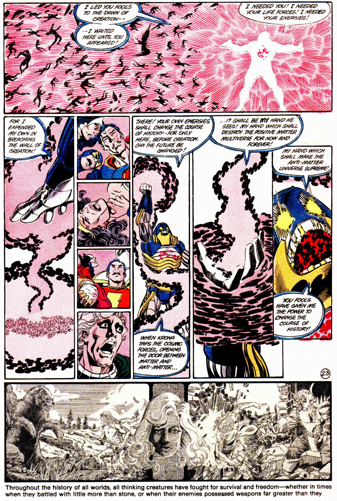 Shortly after this, a being called the Anti-Monitor would begin a quest to wipe out the multiverse. In an effort to save all of existence, Karen teamed up with the heroes and villains from other Earths to confront him. While they proved successful in defeating him, the entire multiverse was lost in the process. Now (supposedly) the only survivor of Earth-Two, and with nowhere left to go, Power Girl was forced to adapt to life on the only surviving Earth