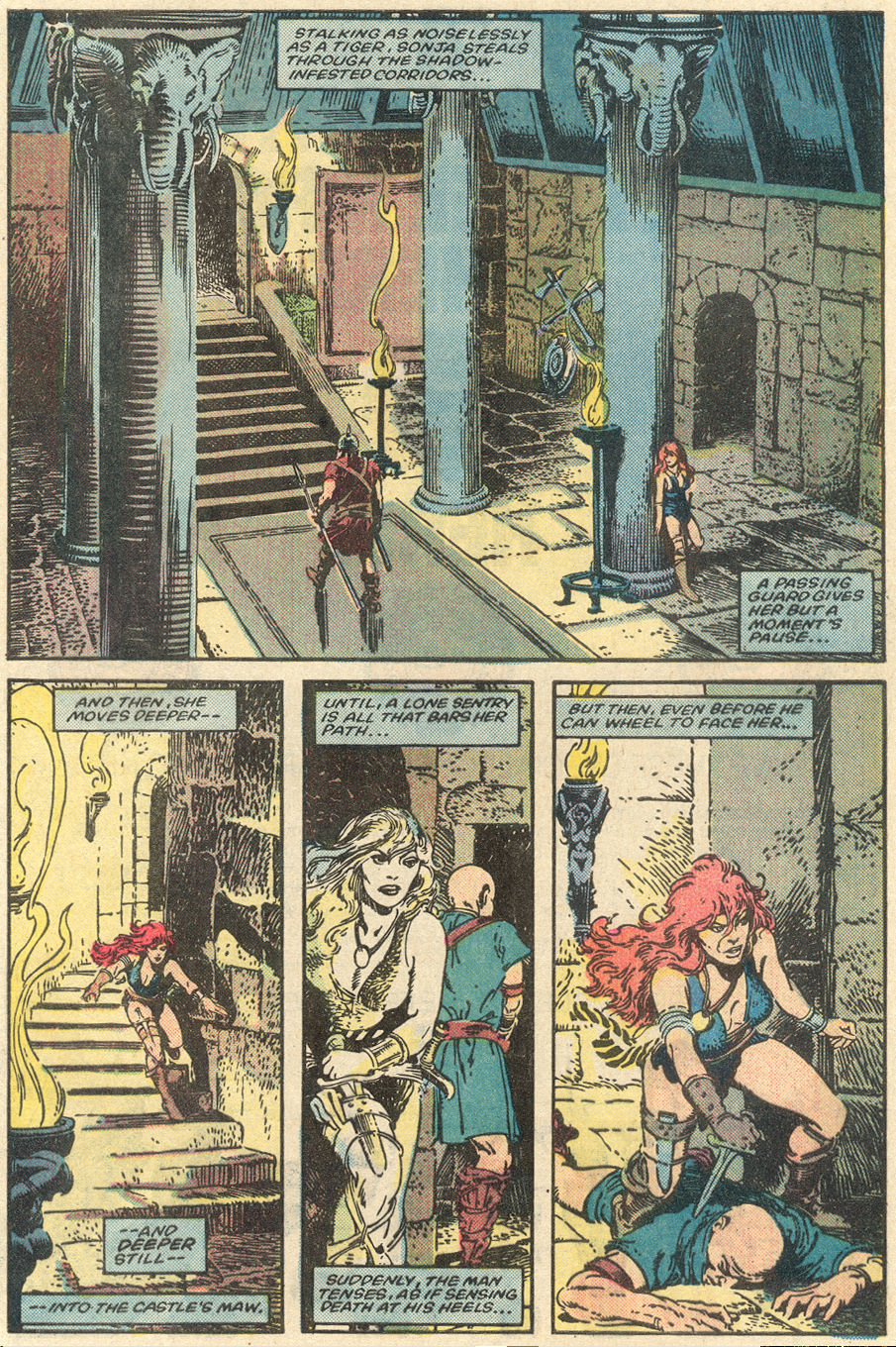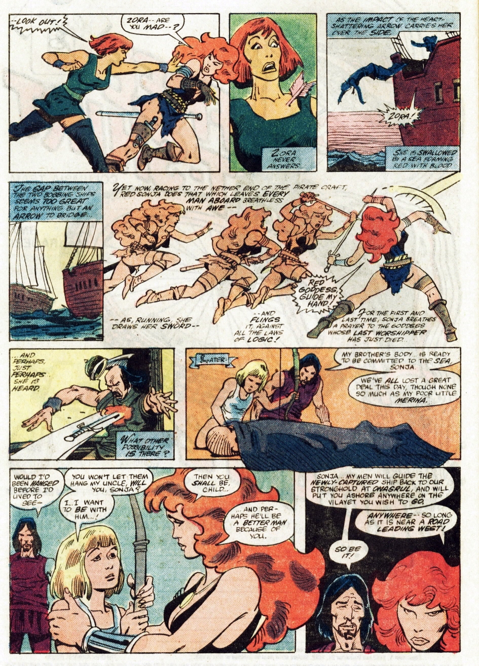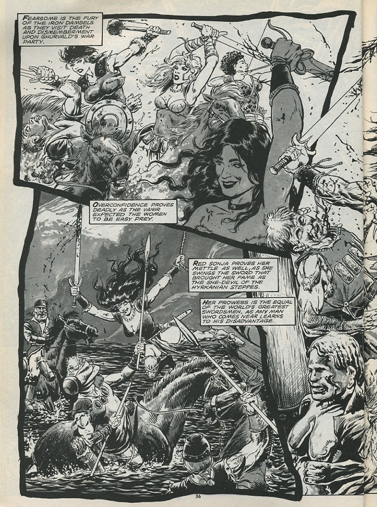 Such feats would include her slaying Trolus, who’s been bred to sword fight since he was born, and the vampire Uathacht, who has been around for centuries and is so old “the stars have forgotten [her] birth.” In her second incarnation as Red Sonja, she killed thousands in battle, and was said to have a trail of blood longer than her life. As Sonja of Dorn, her body count increased to ten million.