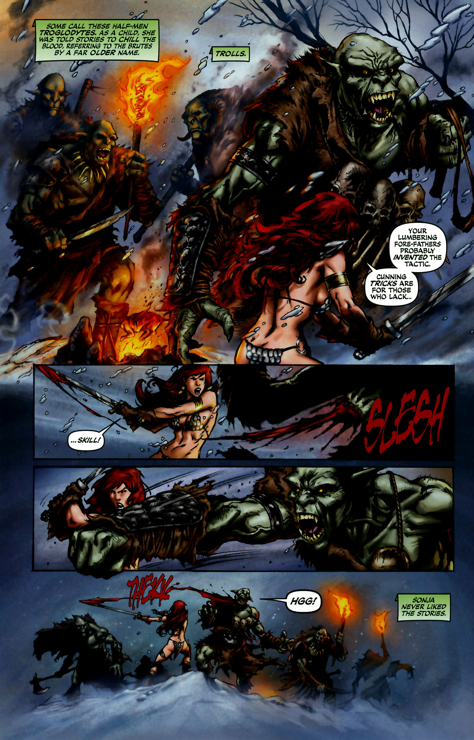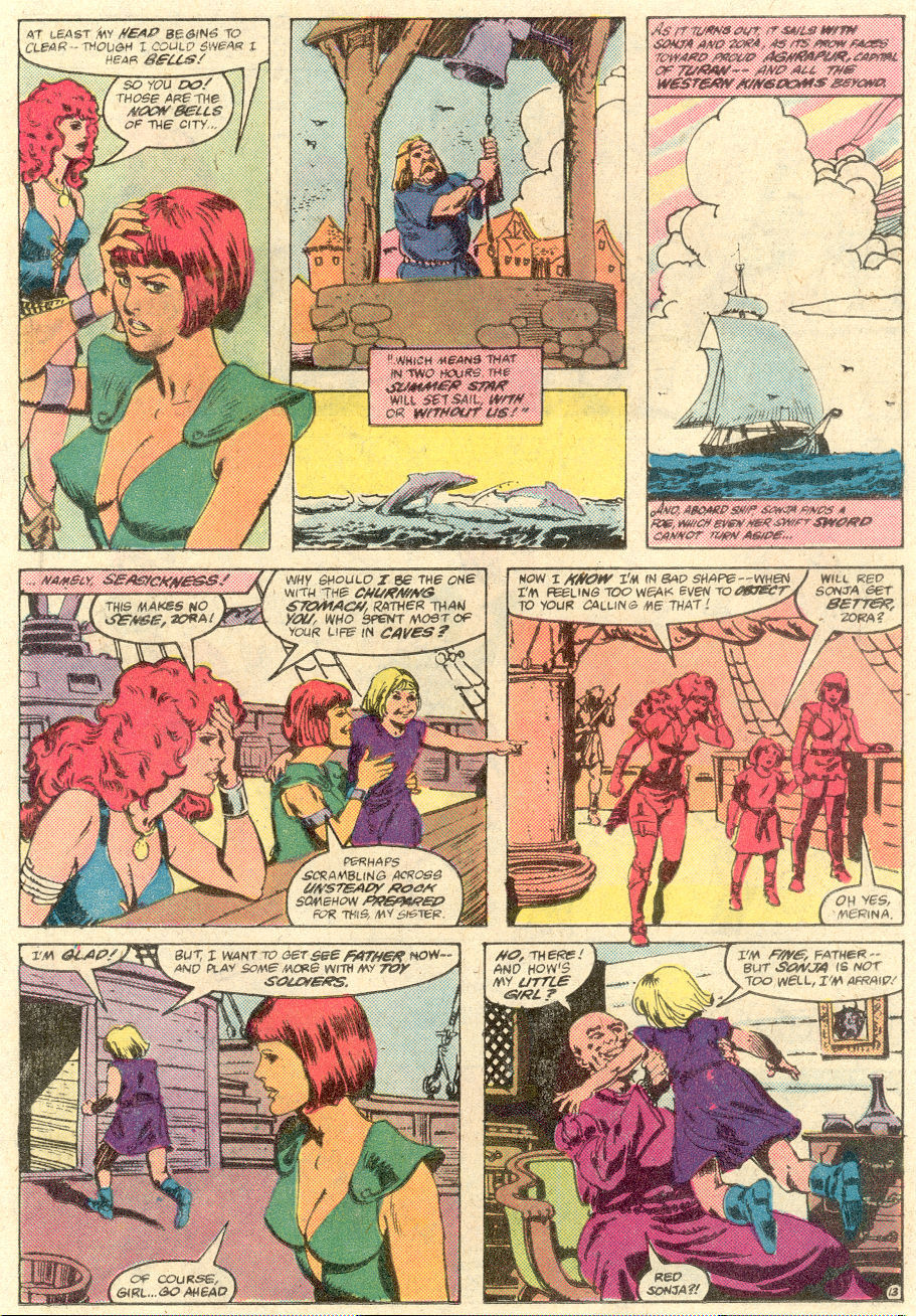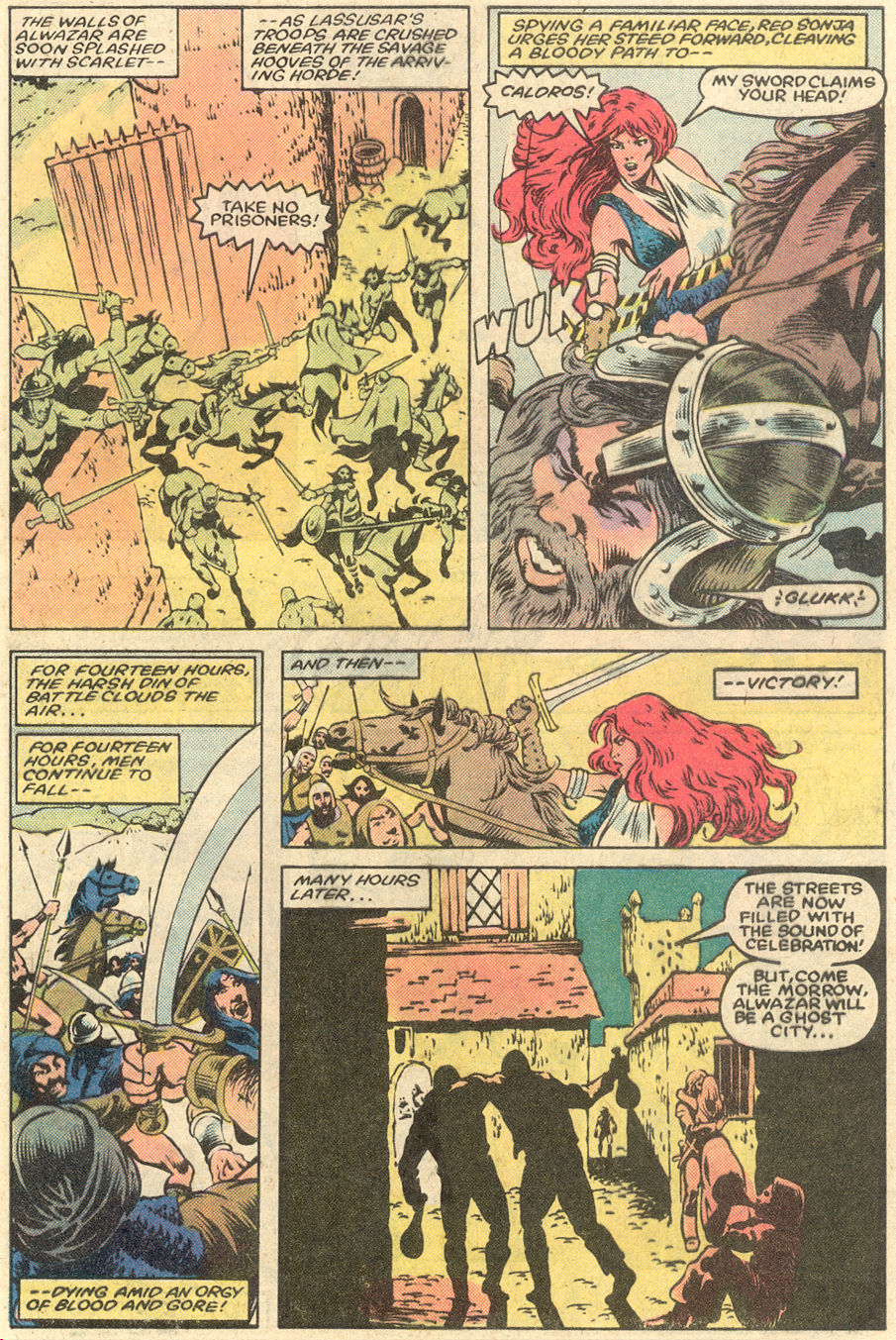 Such feats would include her slaying Trolus, who’s been bred to sword fight since he was born, and the vampire Uathacht, who has been around for centuries and is so old “the stars have forgotten [her] birth.” In her second incarnation as Red Sonja, she killed thousands in battle, and was said to have a trail of blood longer than her life. As Sonja of Dorn, her body count increased to ten million.