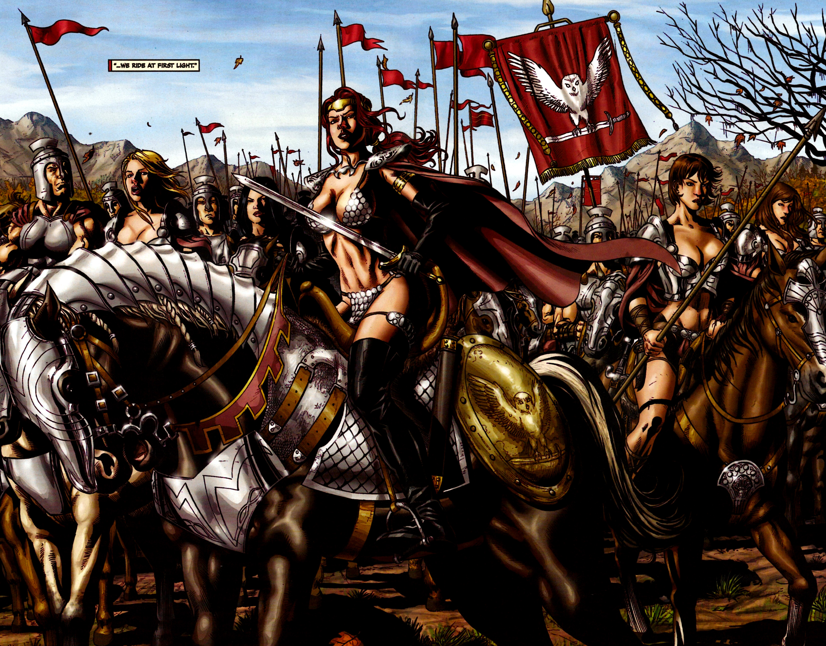 Upon escaping her burning home, Sonja was visited by Scathach, who became infatuated with her desires for revenge. The goddess blessed Sonja with a warrior’s strength on one condition: she must never allow another man (or woman) to bed her unless he (or she) has first bested her in combat.