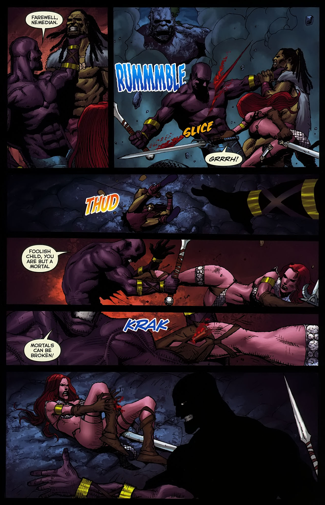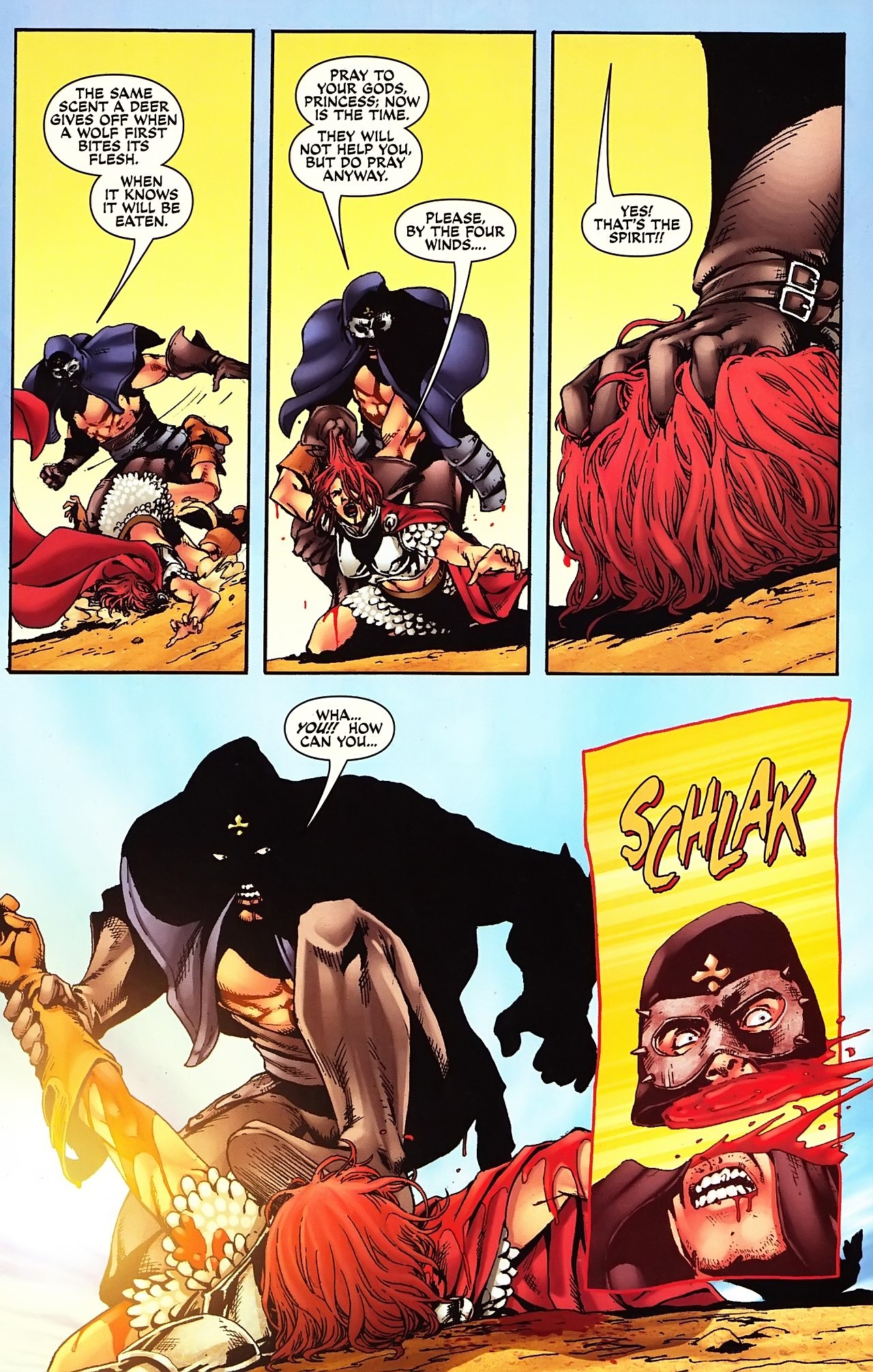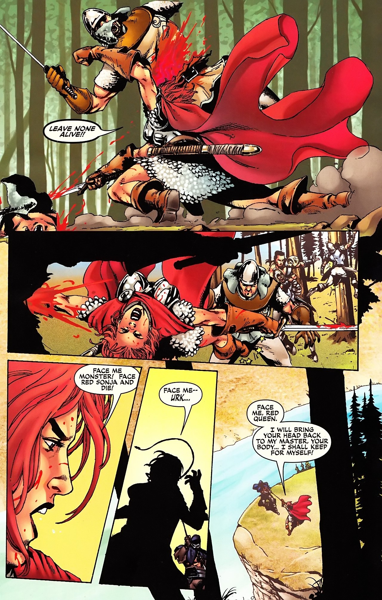 One night, a group of wandering mercenaries happened upon her village, led by her father’s former second in command. The mercenaries slaughtered Sonja’s family before her eyes, and Sonja herself was brutally raped by their leader, who left her to die by setting fire to her house.