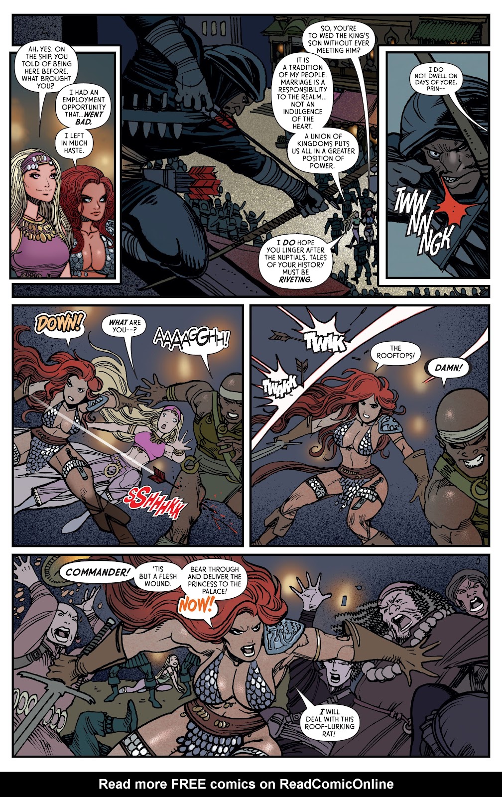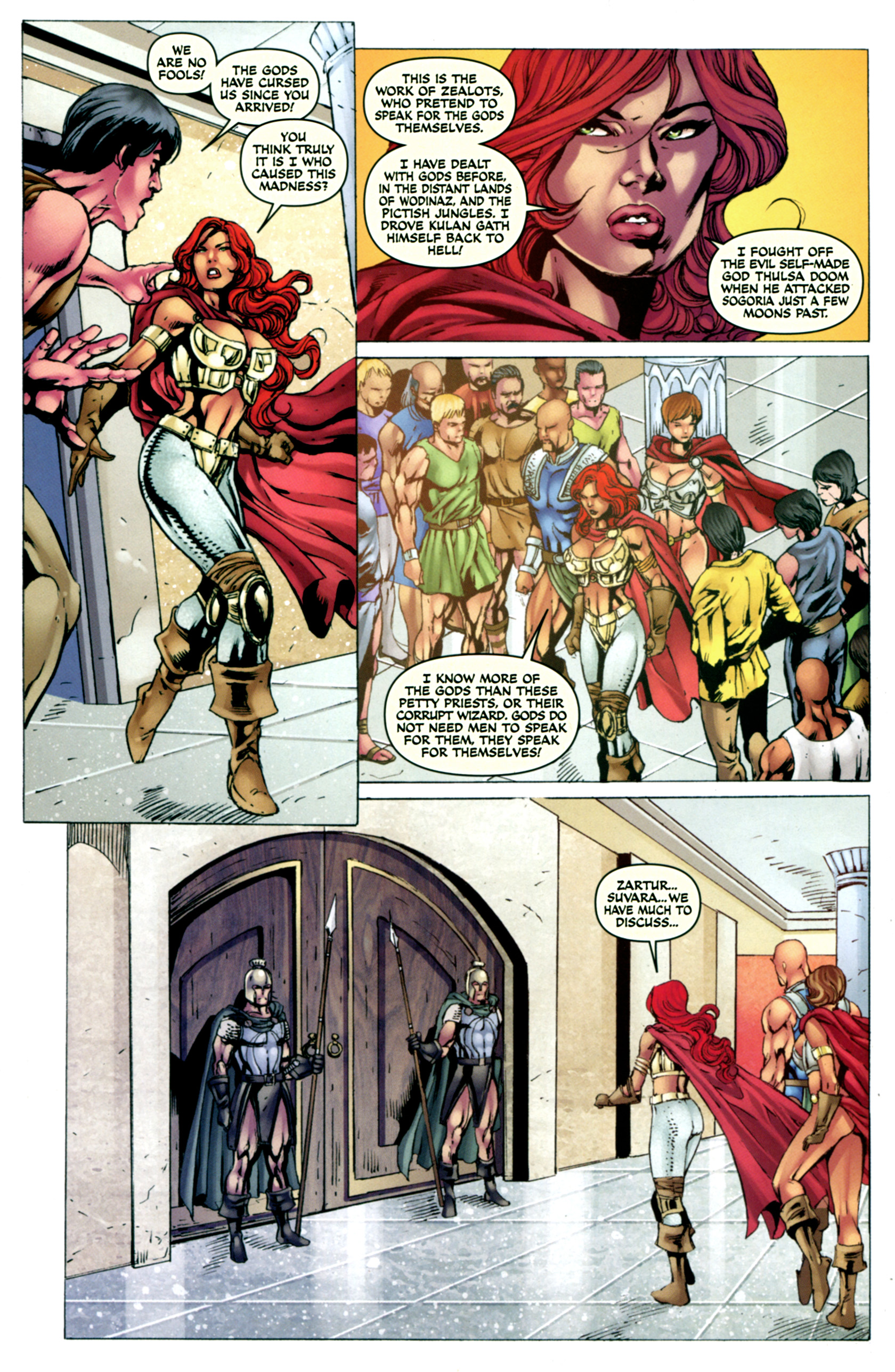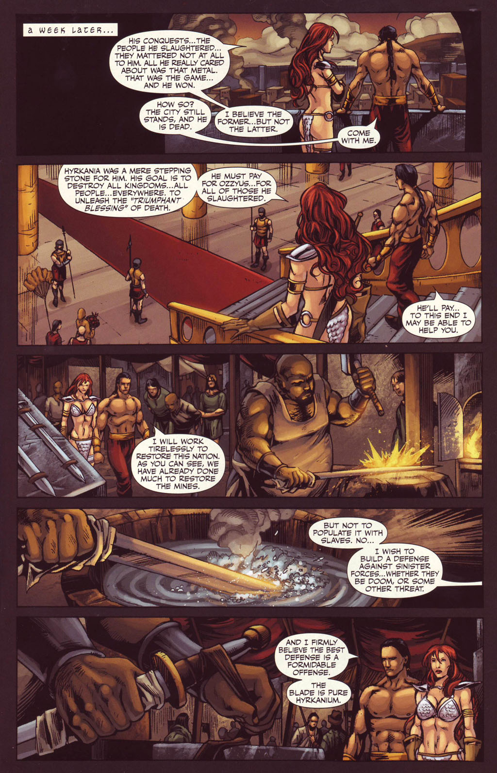 With Osin (a companion from her previous life) acting as her trainer, Sonja became well-versed in the use of a sword, aided in part by subconscious memories of her past selves. Upon learning her husband’s killer, Lucan Martur, had also kidnapped her sister Verona, Sonja stormed his castle, only to learn the two were actually in league. While there, she’d also discover one of Lucan’s most guarded treasures: the armor and sword of the mythical hero Red Sonja. Stirred by subconscious memories, Lady Sonja donned the armor, and in doing so, fully regained her past memories.
