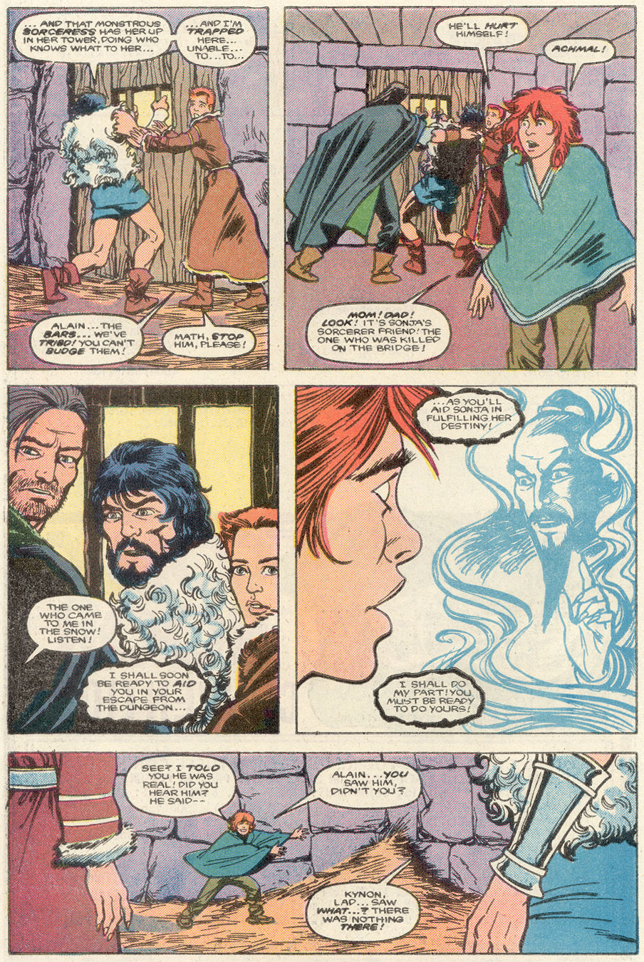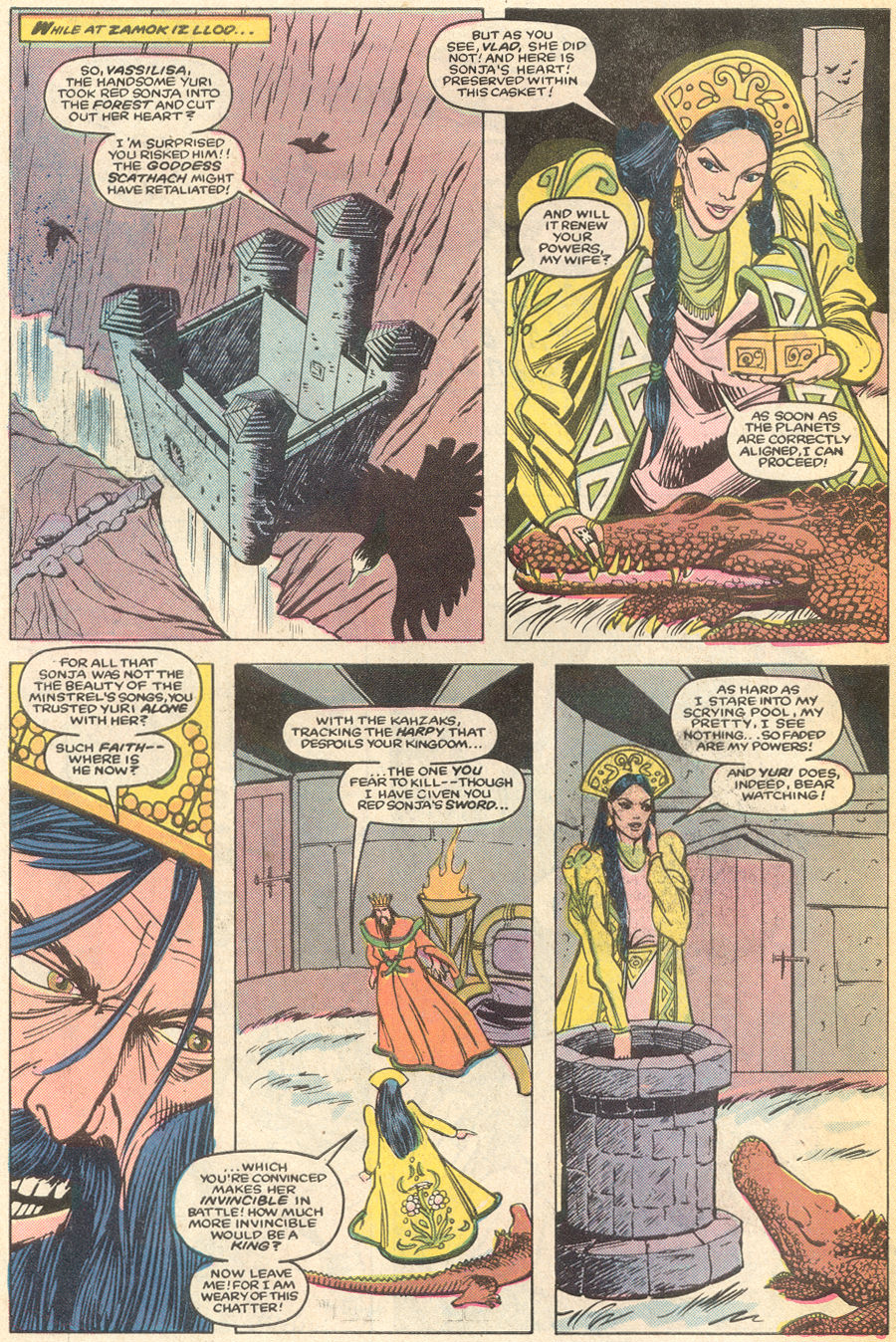 Though she mourned Zora’s death, this didn’t stop Sonja from continuing her adventures. She even gained companions in the form of the wizard Achmal and the Alwazarian warrior Galon, though they were eventually slain in battle. Shortly after, she’d find herself engaged in battle with Vassilisa Iceheart, sorceress queen and sworn enemy of Scathach. With aid from the ghost of Achmal (in reality a servant of Scathach), some new companions, and the blessing of Scathach, Sonja slew the dark sorceress, earning favor in Scathach’s eyes.