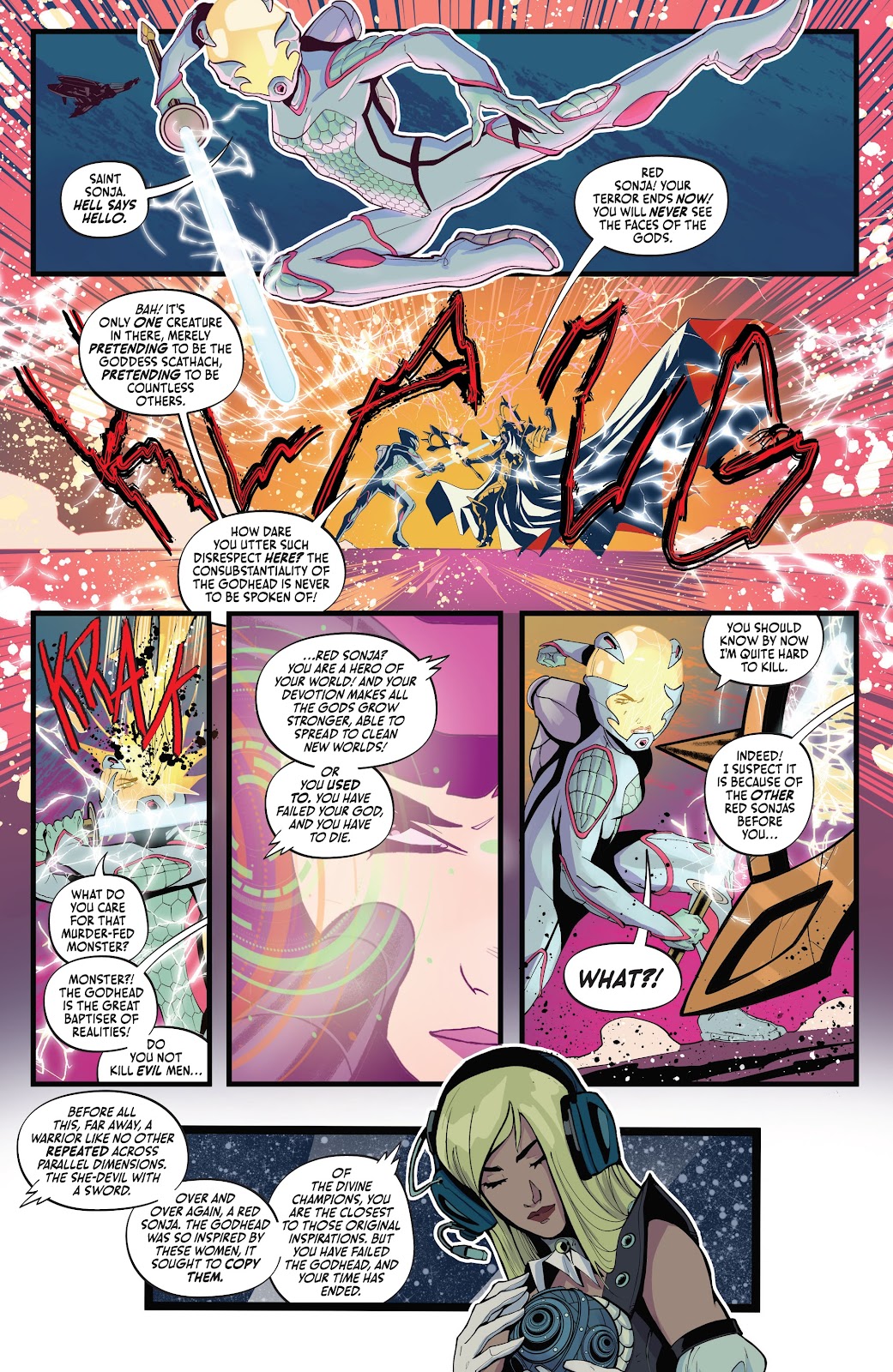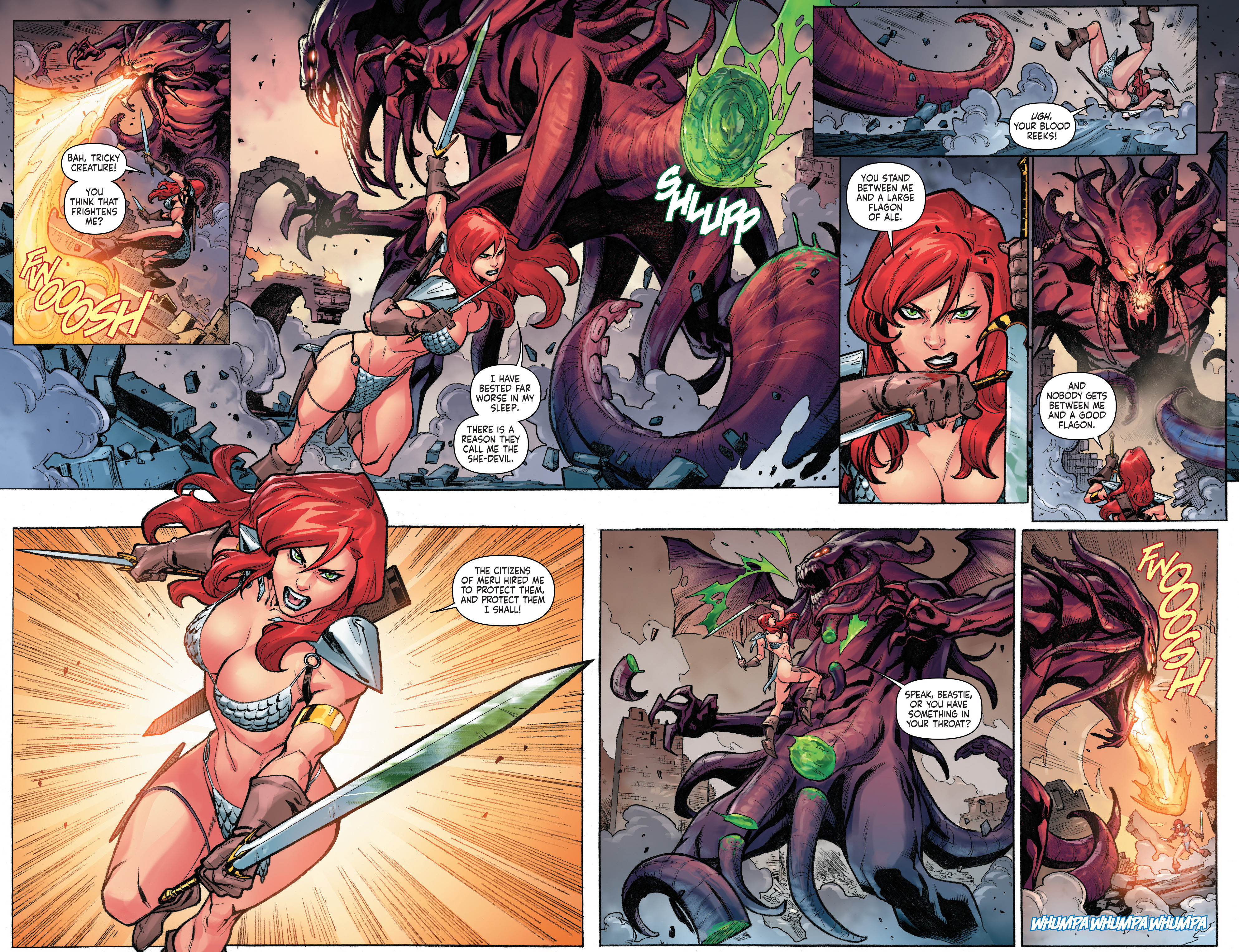 With a body count that high, it’s only natural that she’s fought a wide variety of opponents. She’s defeated swordsmen, spearmen, archers, sorcerers, werewolves, giant trolls, four-armed giants, alchemicmonsters, robots, three elemental dragons that are centuries old, and giants like Surtur, the sea god Leucoth, and a planet-sized mech of herself called Planet Sonja! She’s bested multiple doppelgangers even when they had all her memories and were enhanced by magic, defeated the monstrous swordsman Claw while he was holding nothing back, casually defeated the similarly empowered Crimson Katherine, and overpowered Scathach’s champions and the goddess herself on two different occasions. That last one is particularly impressive since one of them was during a time where Sonja wasn’t empowered by her.