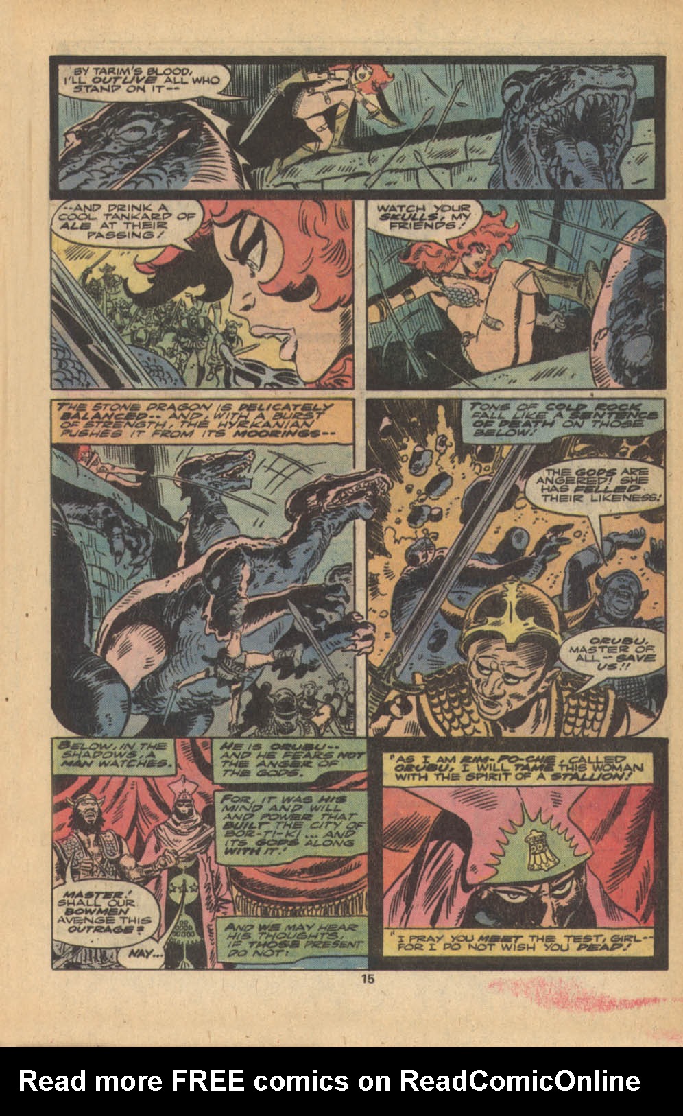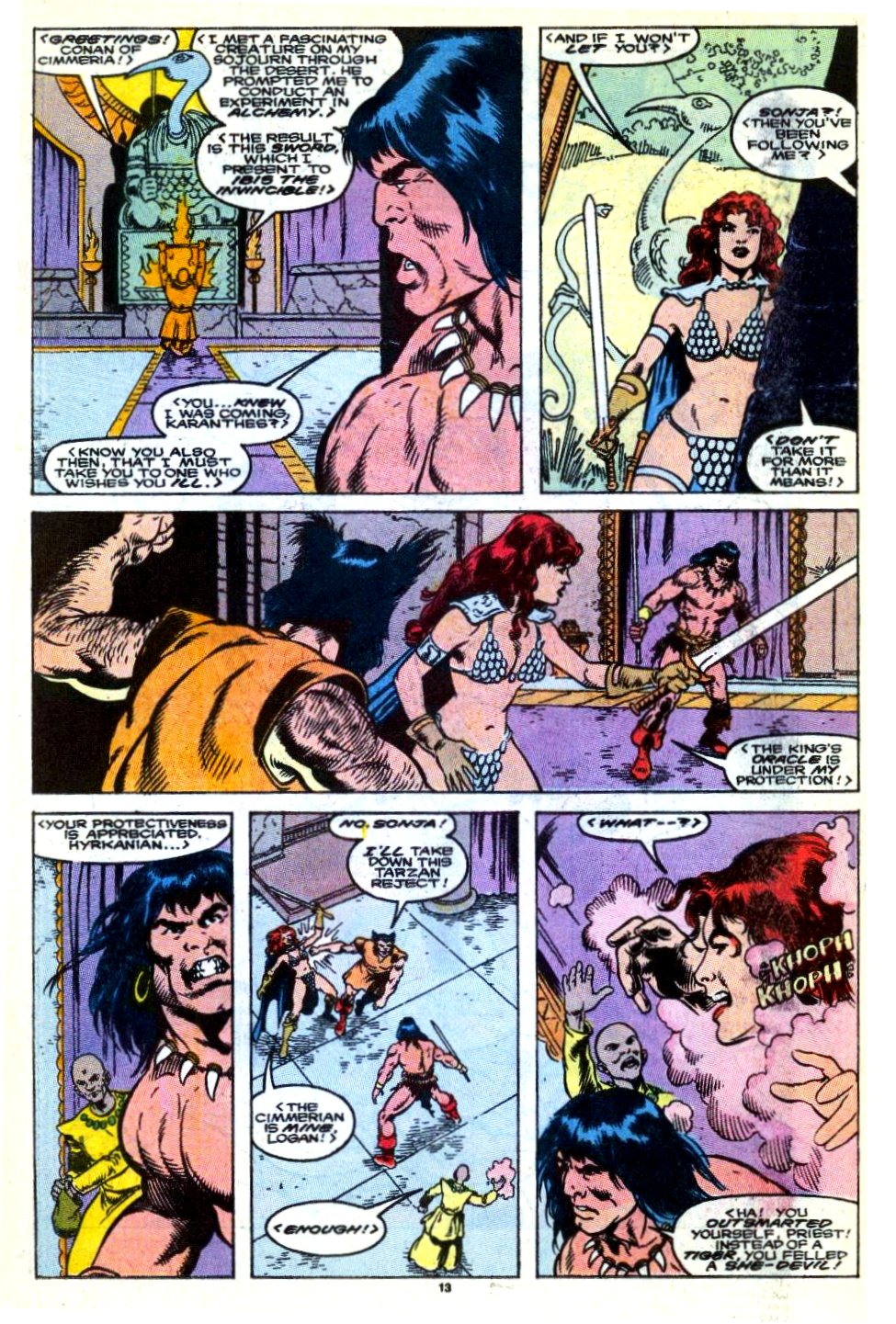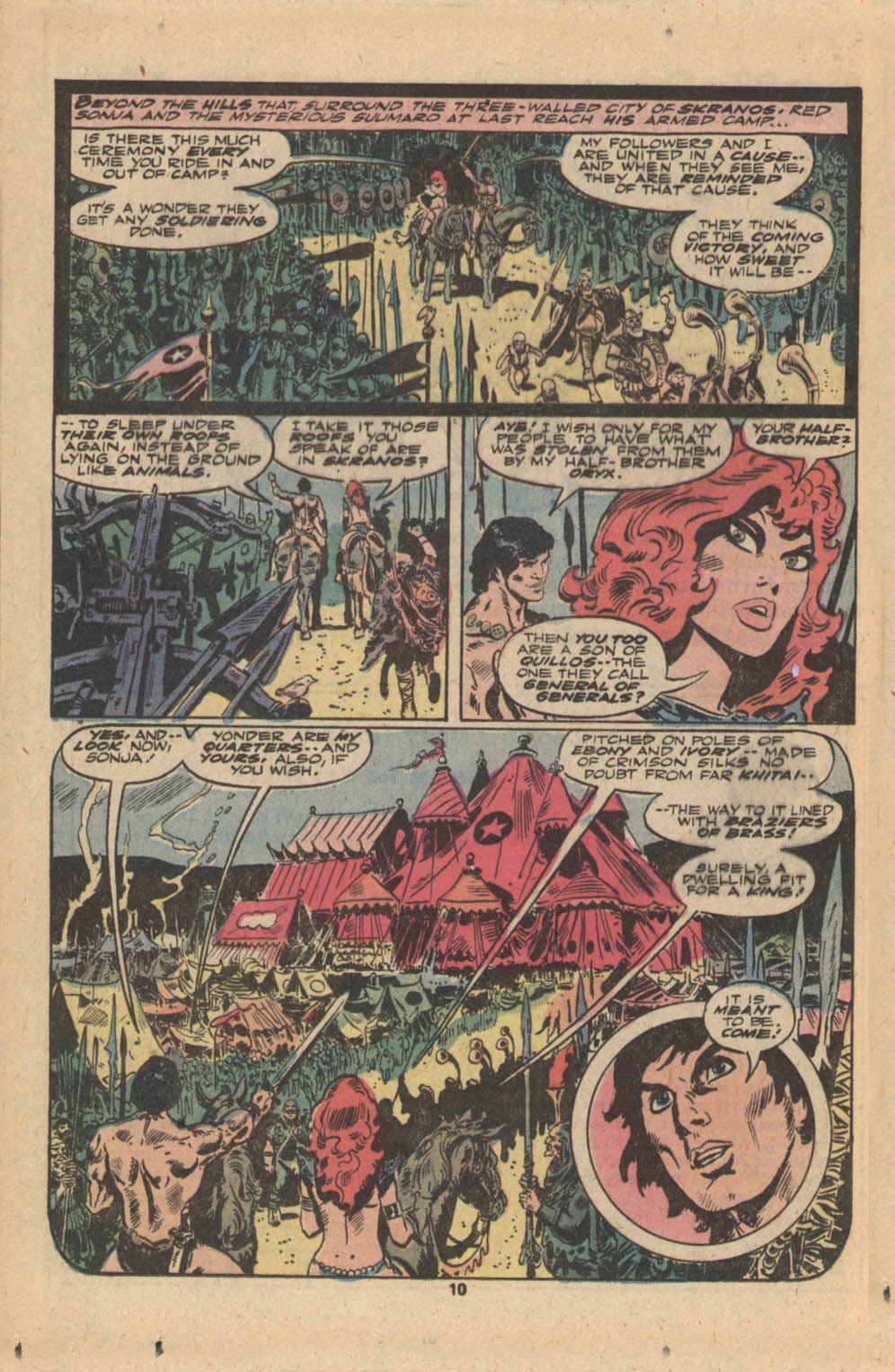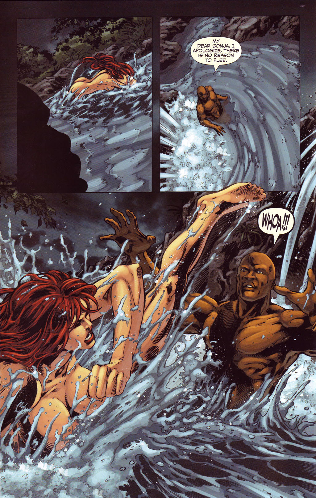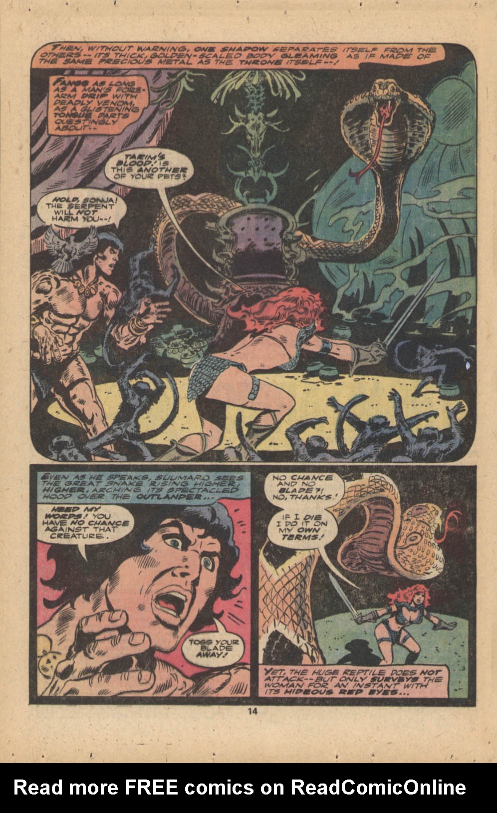 From that day forward, Sonja honed her skills as a warrior until she was unmatched by man or woman. Her reputation grew along with her exploits, and she was soon hired by King Ghaniff of the Hyrkanian city-state Pah-Dishah. Under Ghaniff’s orders, she was to lead his armies and steal a serpent tiara from the neighboring city of Makkalet. During this quest, she would encounter the Cimmerian barbarian Conan and begrudgingly work with him to obtain the tiara and slay its monstrous true form. However, she’d ultimately give Conan the slip and desert him, taking the now inert tiara for herself.