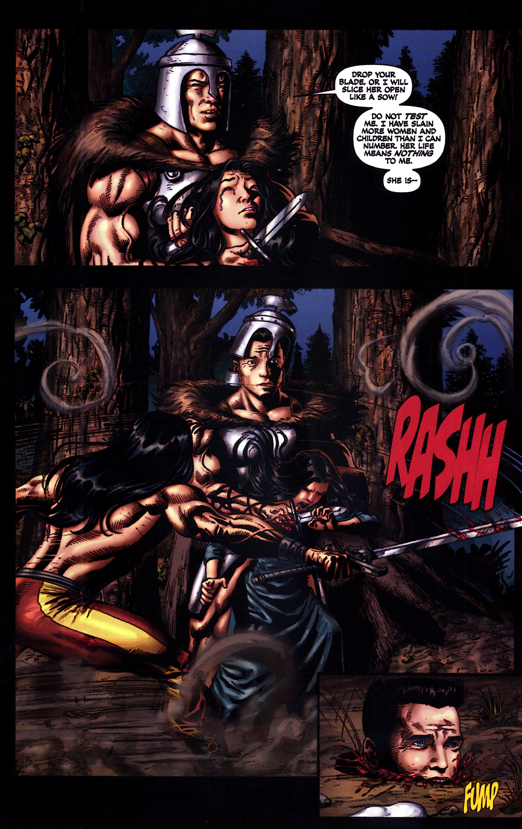 Through reincarnation, Sonja began life once more in Hyrkania, where events would play out similar to before. From a young age, she trained to become a warrior, which inspired her father to take Sonja hunting on her 13th birthday. Upon returning home, they were ambushed by followers of the wizard Kulan Gath, who slaughtered Sonja’s family, raped her, and left her to die by setting fire to her home. Like before, Sonja survived and Scathach appeared before her, comforting her and granting her the honor of becoming her champion in exchange for a vow of celibacy. After agreeing to these terms, Sonja slew the bandit leader and stole the talisman on his neck, swearing she’d one day find the man who caused all this.