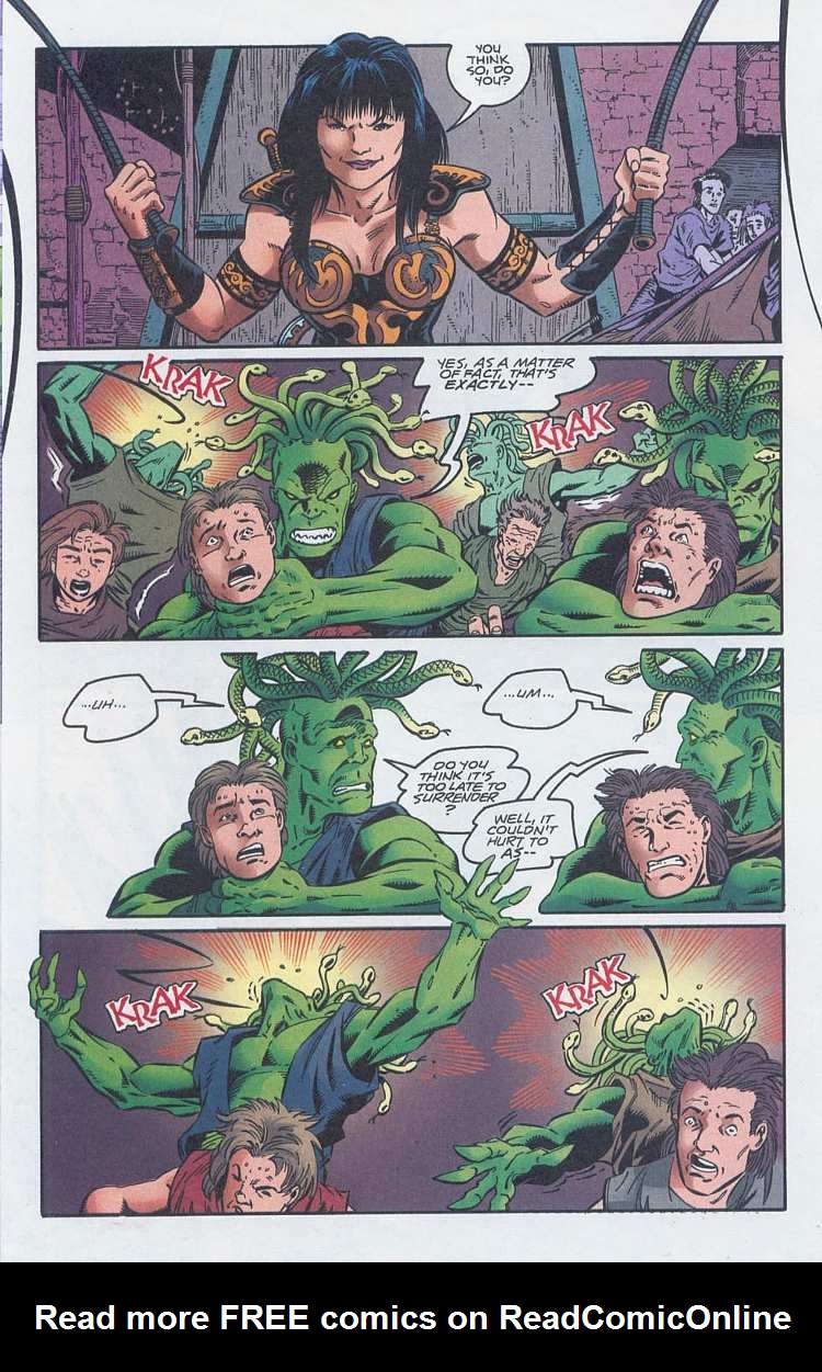 Still distraught over Xena’s death, Gabrielle ignored her last request and began searching for some way to resurrect her. After traveling the globe for months, Gabrielle discovered the cave of the elder god Cthulon and made a deal to “bring everything back to the way it was.” There was just one problem: because of her poor wording, Chtulon had altered the memories of Xena and everyone else, making Xena forget her meeting with Gabrielle and turning her back into a bloodthirsty warlord.