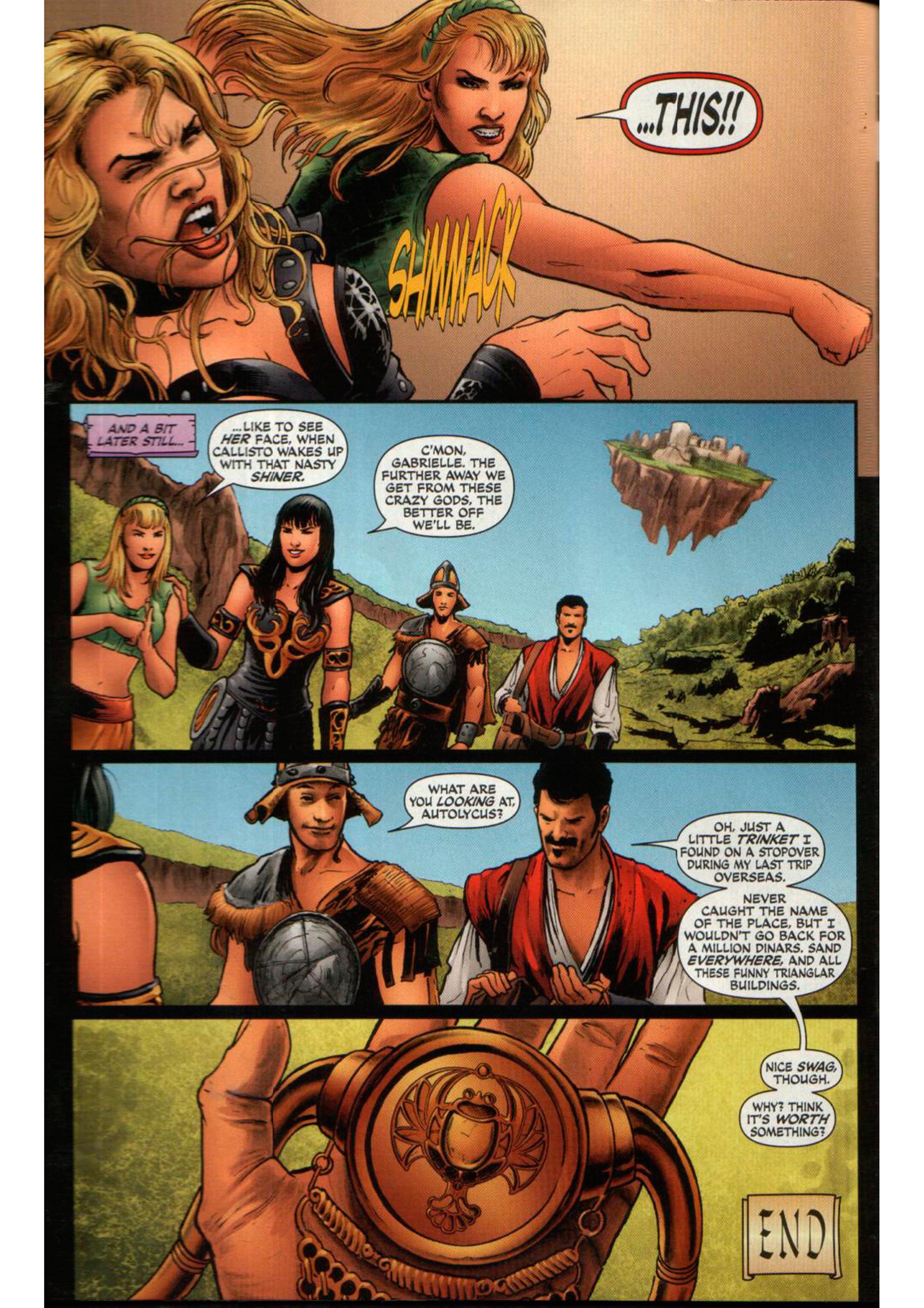 In his latest bid for power, Caesar teamed up with Callisto- now a demon of Hell- to finally kill Xena. After Callisto snapped her spine with her own chakram, Xena and Gabrielle were subsequently captured and crucified, and as they died, they ascended into Heaven where Xena was given the rank of archangel. However, she was quickly forced to relinquish it and ventured into Hell to save Gabrielle’s soul from Callisto, purging the latter of any anger and hatred to convert her to the light.