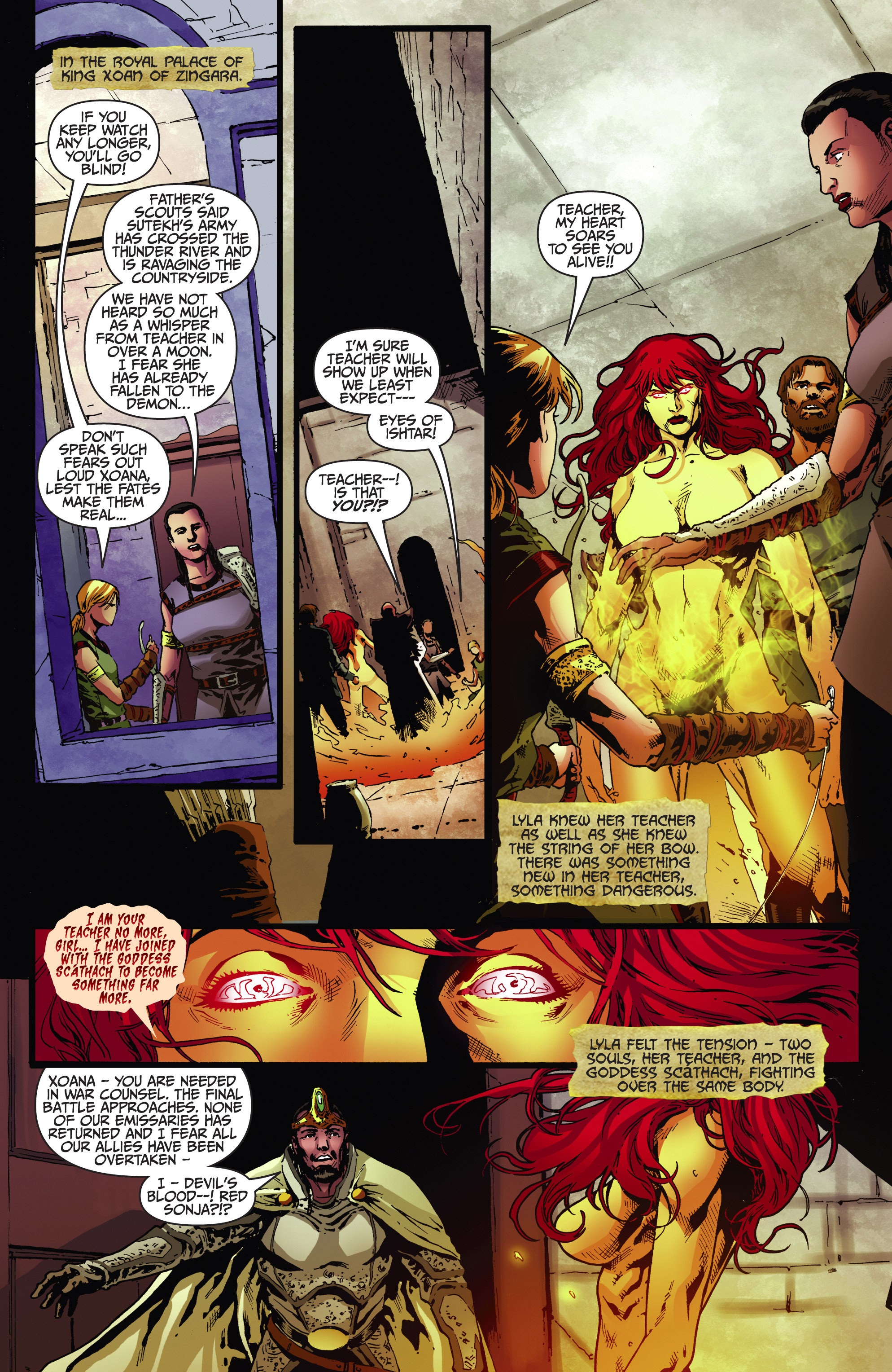 After several years of adventuring, Sonja returned to her home, curious to see how things had changed in her absence. Her curiosity would lead her to a mysterious cave, and upon venturing inside, she discovered a tribe of bronze-skinned people with hair as red as her own. This tribe was known as the Favored, a sub-race of humanity created by Scathach and blessed with unmatched skill in weaponry, all for the purpose of slaying the flesh-eating cave dwellers known as Drommach.